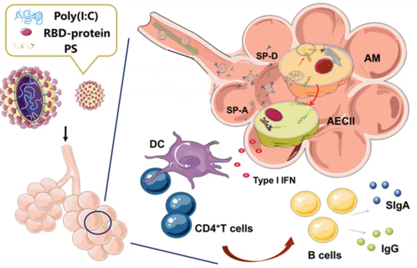 The "capsid" is composed of biomimetic pulmonary surfactant liposomes (bio-PS), a chemical which can be efficiently bound to alveolar macrophages, making it easy for the vaccine to enter the body. The receptor binding domains (RBD) connected to the outer layer of bio-PS are distributed in the outermost layer of virosome as "spike protein", which simulates the natural spatial structure of a single antigen of the virus; Poly (I: C) nucleic acid in the core of virosome as an immune adjuvant can stimulate the natural immune pathway of Toll like receptor 3 (TLR3), and improve the activation of immune system in a safer way.