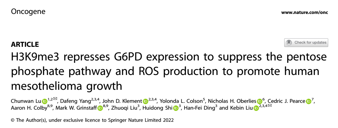 Their novel findings were published in Nature series Journal Oncogene (Impact Factor: 9.867), with the title “H3K9me3 represses G6PD expression to suppress the pentose phosphate pathway and ROS production to promote human mesothelioma growth”. Dr. Lu’s team reported in this article that: H3K9me3 represses G6PD expression to enhance aerobic glycolysis in human mesothelioma. Activation of G6PD increases ROS production to enhance the ROS-regulated cell death pathways to promote mesothelioma apoptosis. A pharmacological strategy that activates G6PD may represent an effective approach to suppress human mesothelioma growth in vivo.
