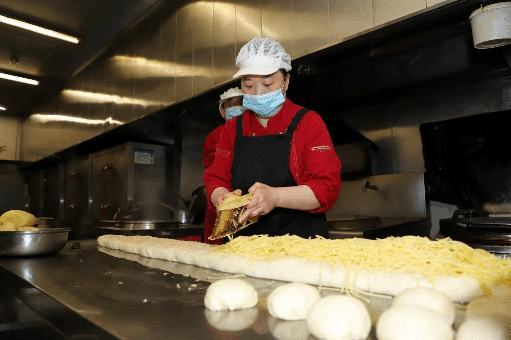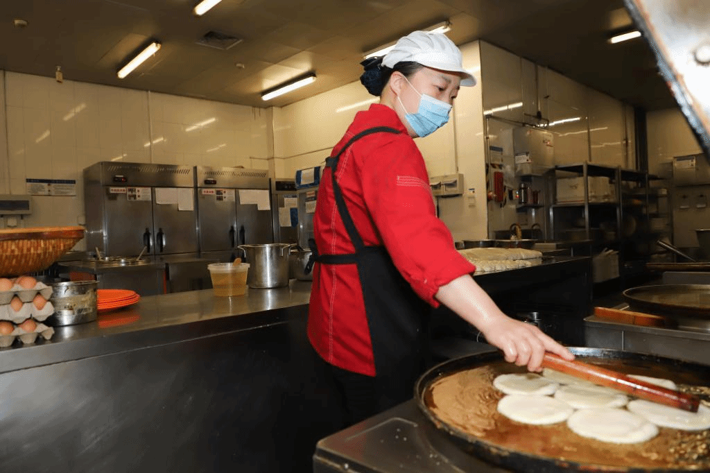 Millet porridge, pickles, steamed buns, fried dough sticks, pancakes, soybean milk… when students are choosing the breakfast they like, the chefs have already started to prepare lunch in the kitchen.