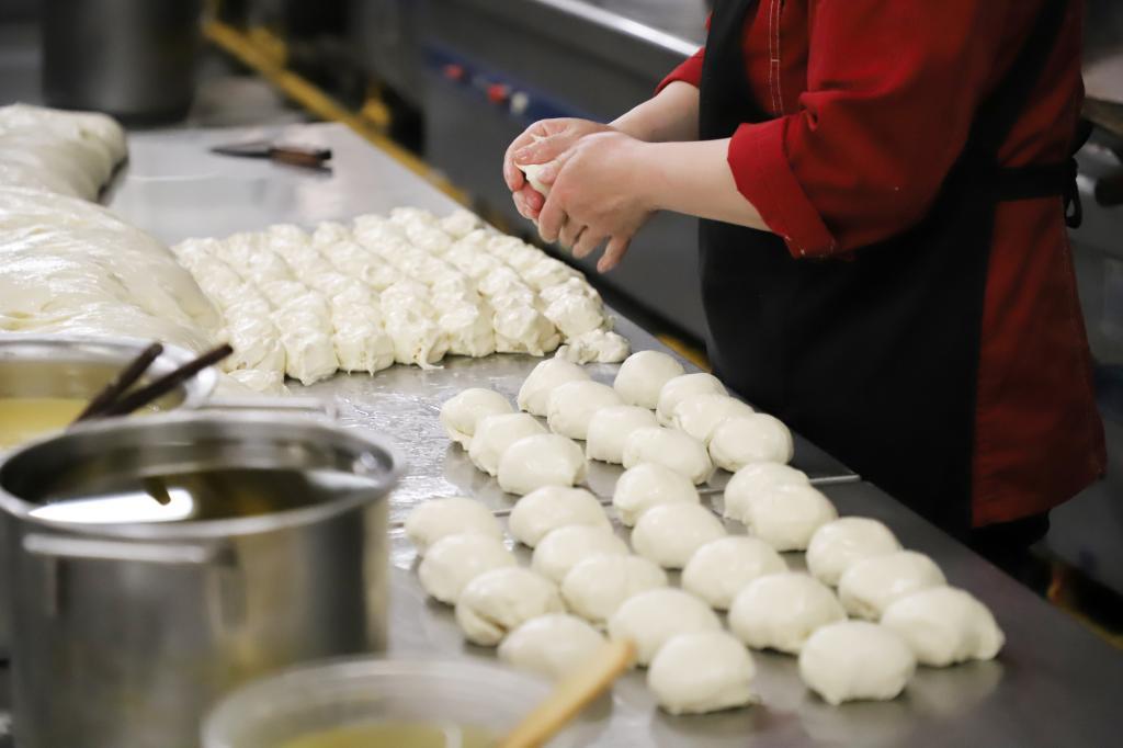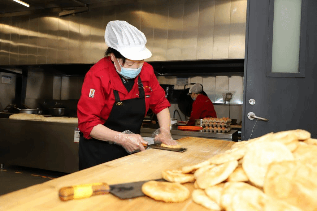 Kneading, greasing, rolling, frying… Ms. Zhou skillfully turns the dough into a variety of breakfasts. “We used to prepare six or seven different kinds of breakfast in the morning so that our students can have more choices,” Zhou said. Usually, 19 pancakes can be put in an electric griddle at a time, and Zhou needs to make eight batches within one hour so that other chefs can have enough time to use the griddle to prepare other breakfasts. They chose to live on campus during the pandemic to ensure safety for the whole campus.