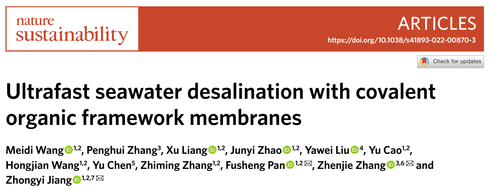 Recently, Prof. Zhongyi Jiang and Prof. Fusheng Pan’s group from Tianjin University (TJU) and Prof. Zhenjie Zhang’s group from Nankai University published an article entitled “Ultrafast seawater desalination with covalent organic framework membranes” in Nature Sustainability (https://www.nature.com/articles/s41893-022-00870-3). PhD candidate Meidi Wang is the first author.