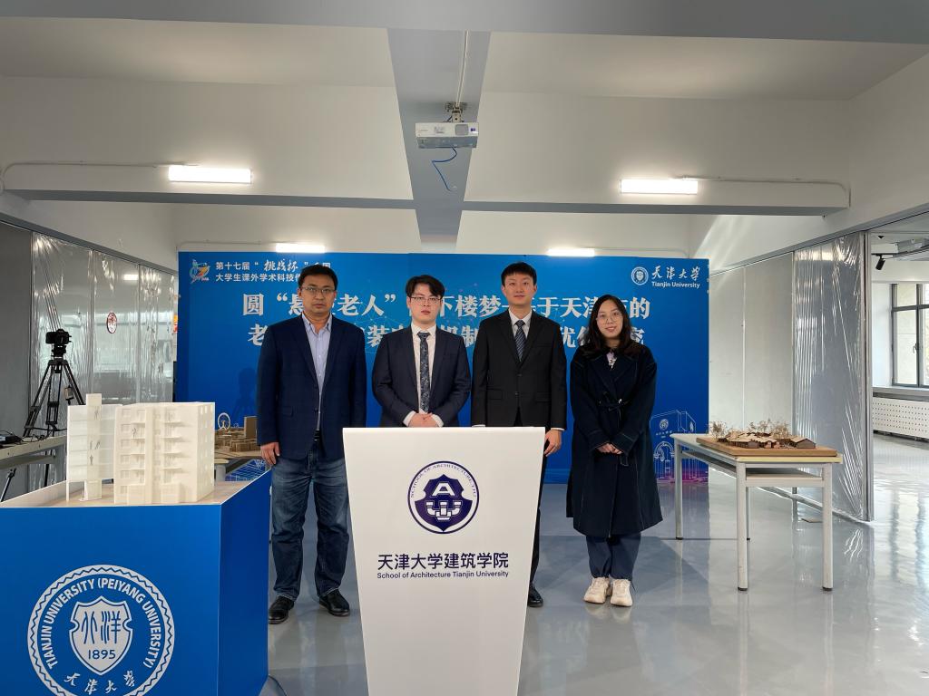 The Second Prize project “Realizing the Dream of the ‘Suspended Elderly’ Going Downstairs—Research and Optimization of Elevator Installation Mechanism in Old Residential Areas of Tianjin” was finished by postgraduates Han Xuan, Kong Debo, and Wang Yuge from the School of Architecture, who had followed advice from Prof. Song Kun. The “suspended elderly” refers to those aged 60 and above living in the old multi-storey residential compounds without elevators, and thus their crying need for going out freely with better living quality became the primary concern of the team. They deeply reached the relevant communities to conduct their research logically through data collection, questionnaire surveys, in-depth interviews, etc., hence analyzing the residents’ intention to pay for the installation of the elevators, the obstacles in front of the related enterprises, and the insufficiency of the corresponding policy. Finally, a set of integrated sustainable implementation modes of elevator installation in those areas was proposed, which was approved by Yan Jianwei, a member of Tianjin CPPCC, and further acquired recognition from relevant authorities.