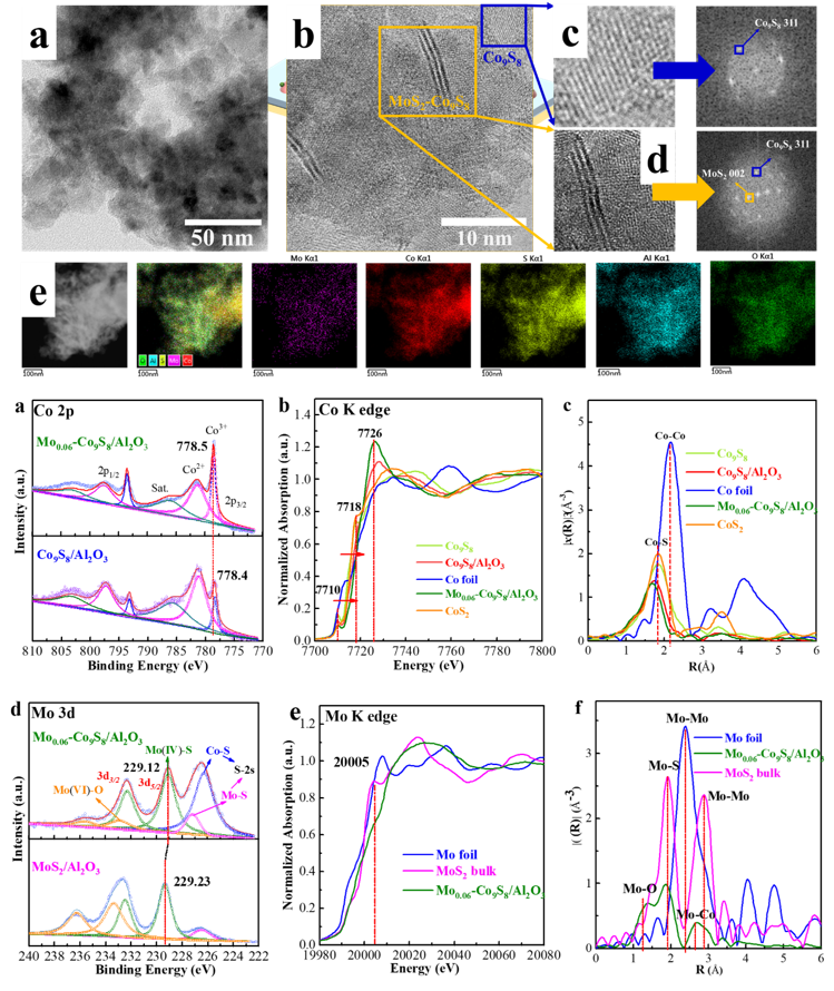 Recently, Professor Ji’s group from the School of Environmental Science and Engineering constructed a new catalytic material of Mo doped Co9S8 nanoparticles anchored on Al2O3 matrix by a simple method with CoAl-hydrotalcite as a precursor. In this multifunctional assembly Mo-Co9S8/Al2O3 catalyst, the Mo atom is coordinated to three bridging S atoms on the top site of Co9S8, resulting in theoretical CNMo-S= 3. This Mo-Co9S8 interface exhibits electron transfer from Co to Mo sites, and possesses the unique capability for the adsorption of oxygenated compounds, which could selectively convert lignin to arenes with high hydrodeoxygenation activity and selectivity. More importantly, the catalyst displays superior tolerance to high reaction temperature, and resistance against being poisoned by H2O, owing to the anchoring effect of Al2O3 matrix and “protection” of Co9S8. In particular, it also shows compatibility in the conversion of different substrates including lignin bio-oil and real lignin. This work not only establishes an active and high-temperature stable catalyst (MoCo9S8/Al2O3) for the HDO of lignin, but also stimulates mechanism understandings and provides an effective strategy to design more efficient and stable sulfide catalysts for high-temperature reactions in the future. Related research results named <Fabricating high temperature stable Mo-Co9S8/Al2O3 catalyst for selective hydrodeoxygenation of lignin to arenes> has been published in the internationally renowned journal Applied Catalysis B: Environmental (IF=19.052) (https://doi.org/10.1016/j .apcatb.2022.121067).