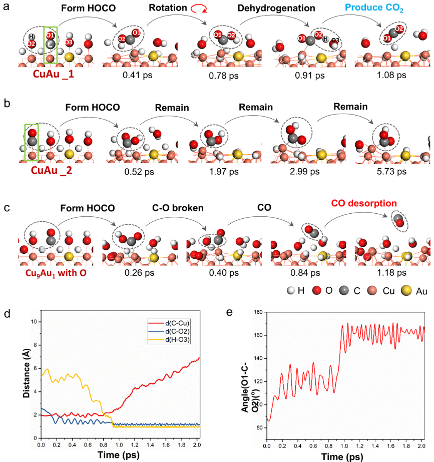 Furthermore, the reaction routes when CO adsorbed on different Cu sites on CuAu surface and O adsorbed on CuAu surface were investigated systematically through AIMD simulations. The results show that WGSR can be promoted when CO is adsorbed on Cu sites adjacent to Au (Figure 4), further demonstrating the synergistic relationship between Cu and Au under WGSR.