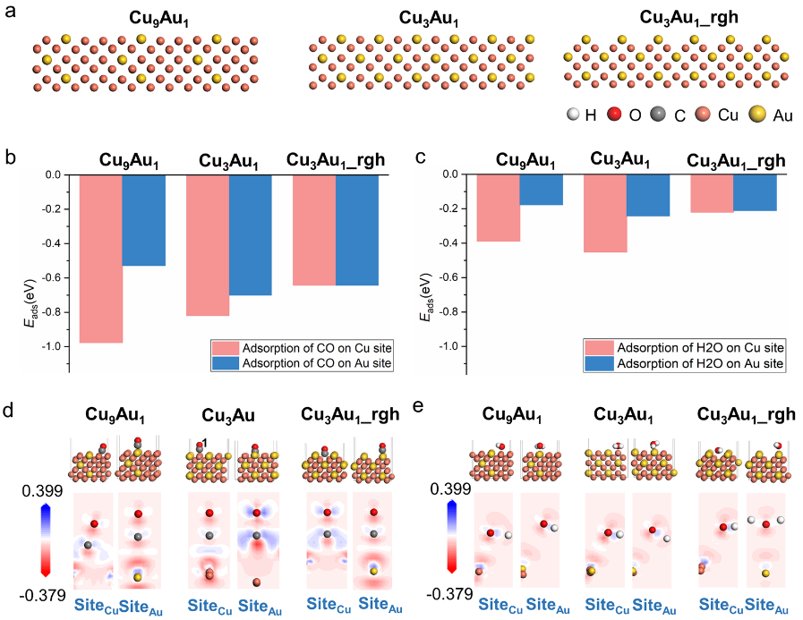 DFT calculation was employed to find the possible adsorption sites of CO and H2O on CuAu surface to understand the surface reconstruction phenomenon results from gas adsorption (Figure 2). Researchers designed three different structure models (Cu9Au1, Cu3Au1, Cu3Au1_rgh) for calculations based on the surface segregation of Au and the rough surface under CO atmosphere. The DFT calculation results could reasonably explain the observed phenomenon, i.e., CO is preferred to adsorbed on Au atom at the top of the rough surface to form the elongated lattice points and H2O is preferred to adsorbed on the bridged Cu sites to form smaller lattice points between the CuAu lattice points.