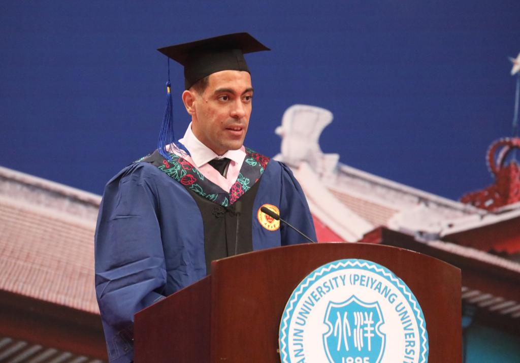 Good morning. I’m Wu Ruilong from Venezuela in South America. I once delivered the commencement talk on behalf of international undergraduates of Tianjin University in June of 2018. So, it’s my great honor to be here on such a memorable and solemn occasion for the second time in 2022 and now I have completed my master’s degree in Cross-Cultural Education from the School of International Education. Therefore the theme of my speech today is “thanks”.
