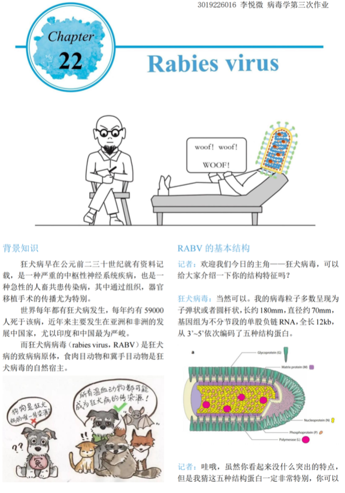 Comments: This assignment is for a professional virology paper. The features, hazards and destructive effects of the rabies virus are described in a witty tone through the form of an interview. A number of animal illustrations are also included in the assignment, making it more interesting.