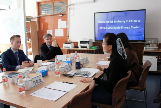 On March 23, a delegation of the U.S. Embassy in Beijing, China led by Foreign Service Officers Mr. Travis Glynn and Mr. Todd Hannah visited APEC Sustainable Energy Center (APSEC). Wei Youxiang, Deputy Director of the Office of International Cooperation of Tianjin University, and Professor Zhu Li, President of APSEC, attended the meeting.