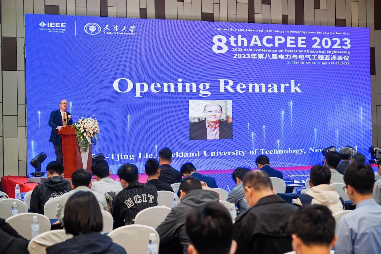 ACPEE 2023 kicked off on April 15. The opening ceremony was presided over by Professor Zhu Jiebei from TJU School of Electrical and Information Engineering. Professor Tan Chao, Dean of the School of Electrical and Information Engineering of Tianjin University, Professor Tek-Tjing Lie from Auckland University of Technology and Professor Luan Wenpeng, chair of the conference, delivered opening remarks.