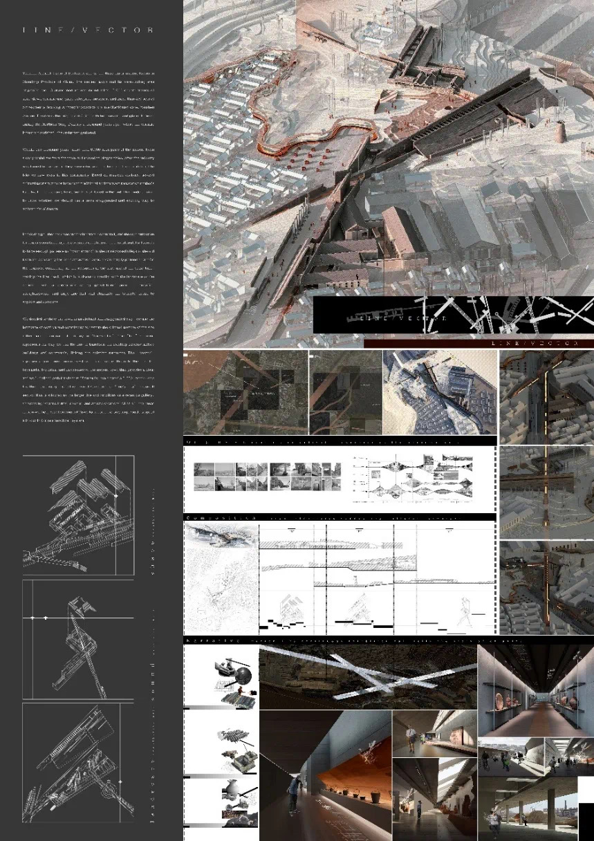 “Line/Vector" is the "8+" graduation design work of architecture majors in China. The topic is located in Yanshen Ancient Town of Boshan District, Zibo City, which is the "Porcelain Capital of the North of the Yangtze River". It focuses on exploring a renewal strategy to revitalize this historical area where traditional residential houses coexist with industrial heritage, and constructing a place with profound historical and cultural background. . The design proceeds sequentially from the different scales of "City-Ancient Town-Architecture", abandoning the harmonious spatial dialogue formed solely by environmental texture, but rather adopting the logic of landscape narrative and linear design to complete a strong-narrative expression of spatial paths with a combination of f light and shadow, the collocation of materials, and the special shaping of the scale, to creates a ceramic showroom with a quiet atmosphere. The design organically integrates the regional nodes of Yan Shen Ancient Town, emphasizes the history and regional characteristics of the town, and connects the existing cultural resources of the site.