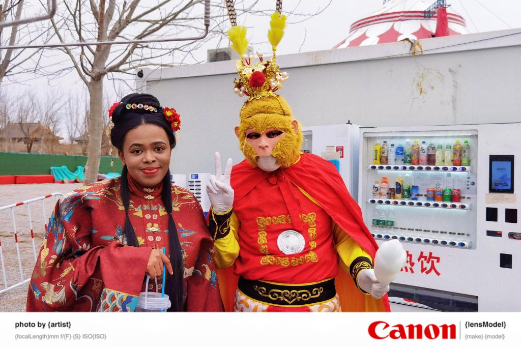 Dressed up in Chinese traditonal clothers, Mroivili takes a photo with personifying Monkey King.