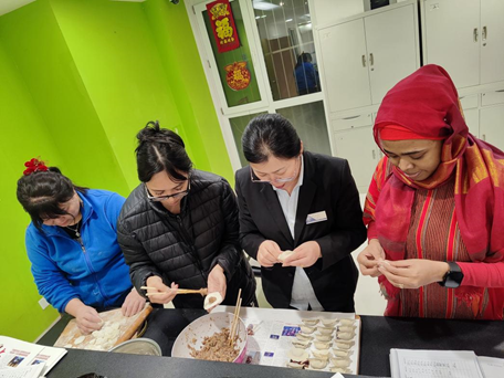 Mroivili together with dorm aunties make dumplings on the New Year's Eve