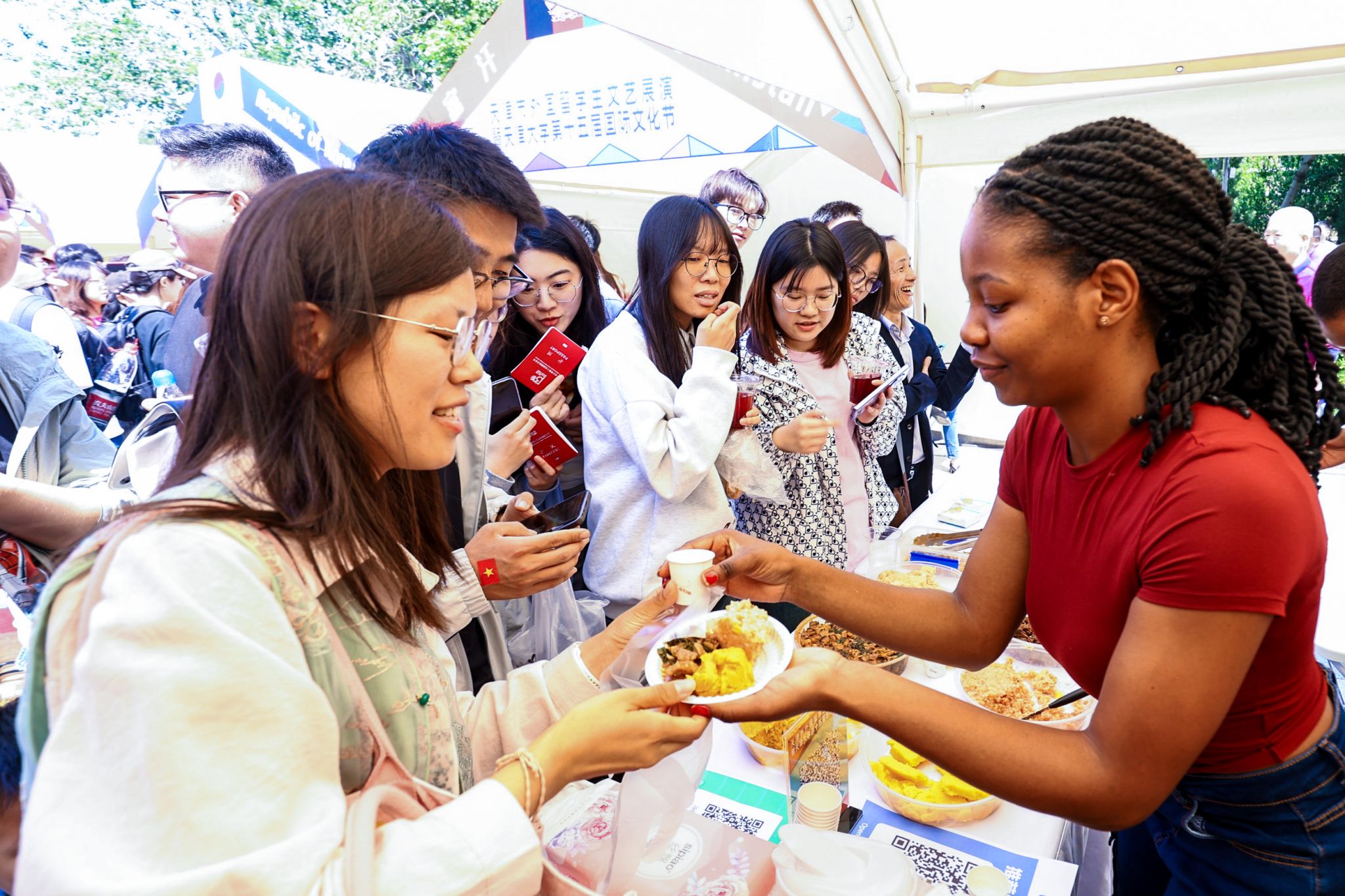 Alongside the performances, Peiyang Square was transformed into a “global village” with nearly 50 cultural booths. Visitors sampled international cuisines, including Malaysian nasi lemak and satay, Vietnamese pho, and Egyptian rice pudding. Interactive activities such as henna art, mosaic-making, and traditional costume try-ons drew large crowds.