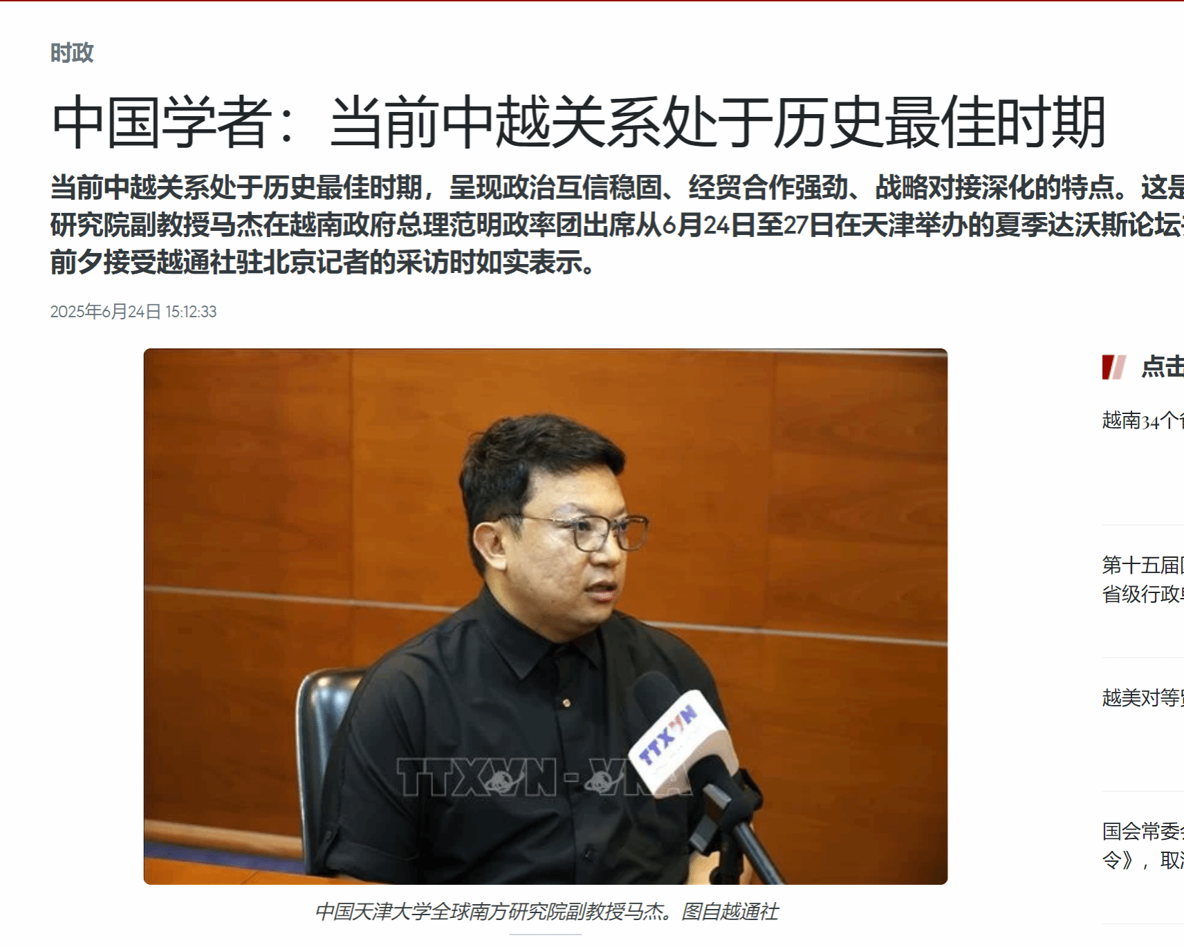 On June 23, the eve of the 2025 Tianjin Summer Davos, Associate Professor Ma Jie from the Institute for Global South Studies at Tianjin University was interviewed by the Vietnam News Agency (VNA), where he shared his unique insights into the current positive development of China-Vietnam relations and the prospects for cooperation among Global South countries. Following the interview, VNA published a report titled "Chinese Scholar: China-Vietnam Relations at Their Best in History" in both video and text formats, which widely disseminated Associate Professor Ma’s perspectives.